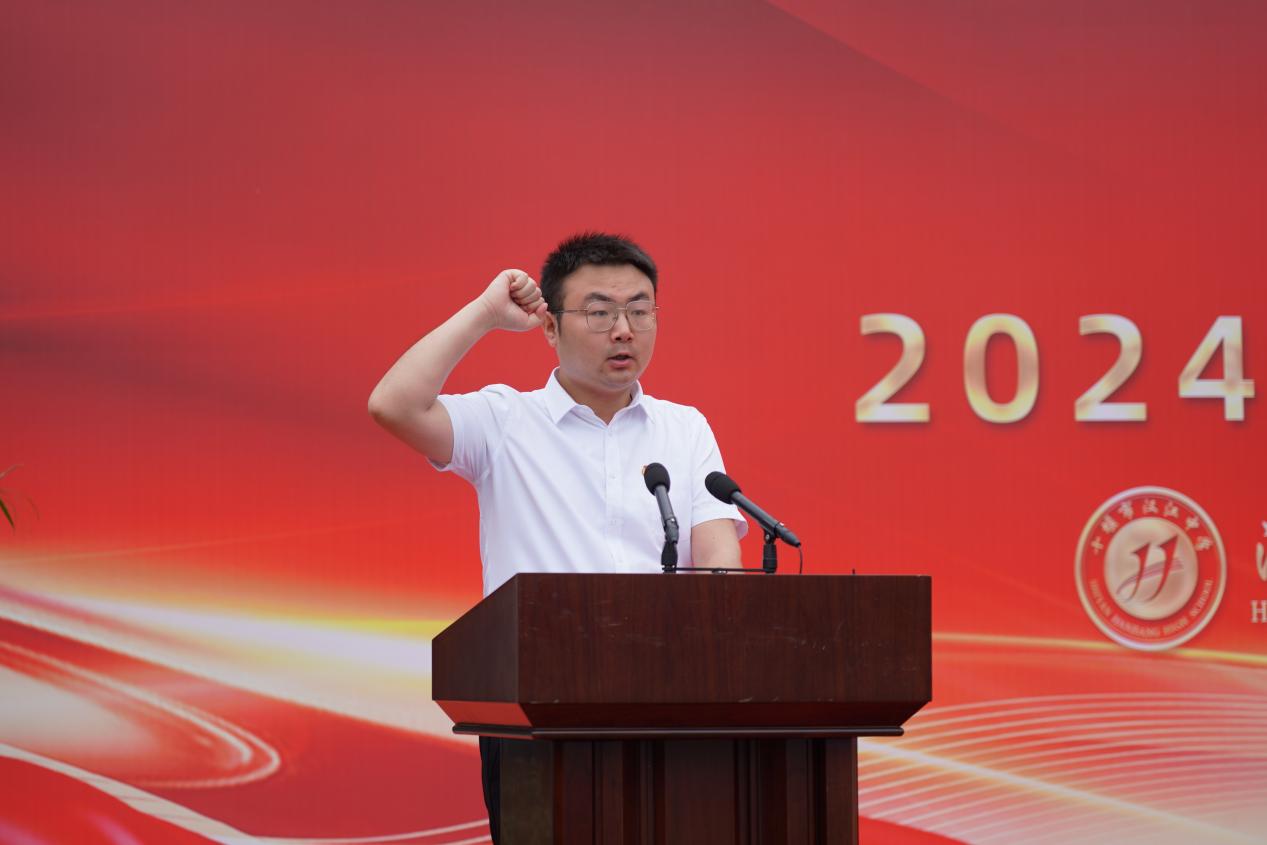汉江实验学校九一班学生王虎臣、汉江中学地理教师秦伟分别作为学生代表和老师代表进行郑重宣誓,勇敢追梦,立根铸魂。