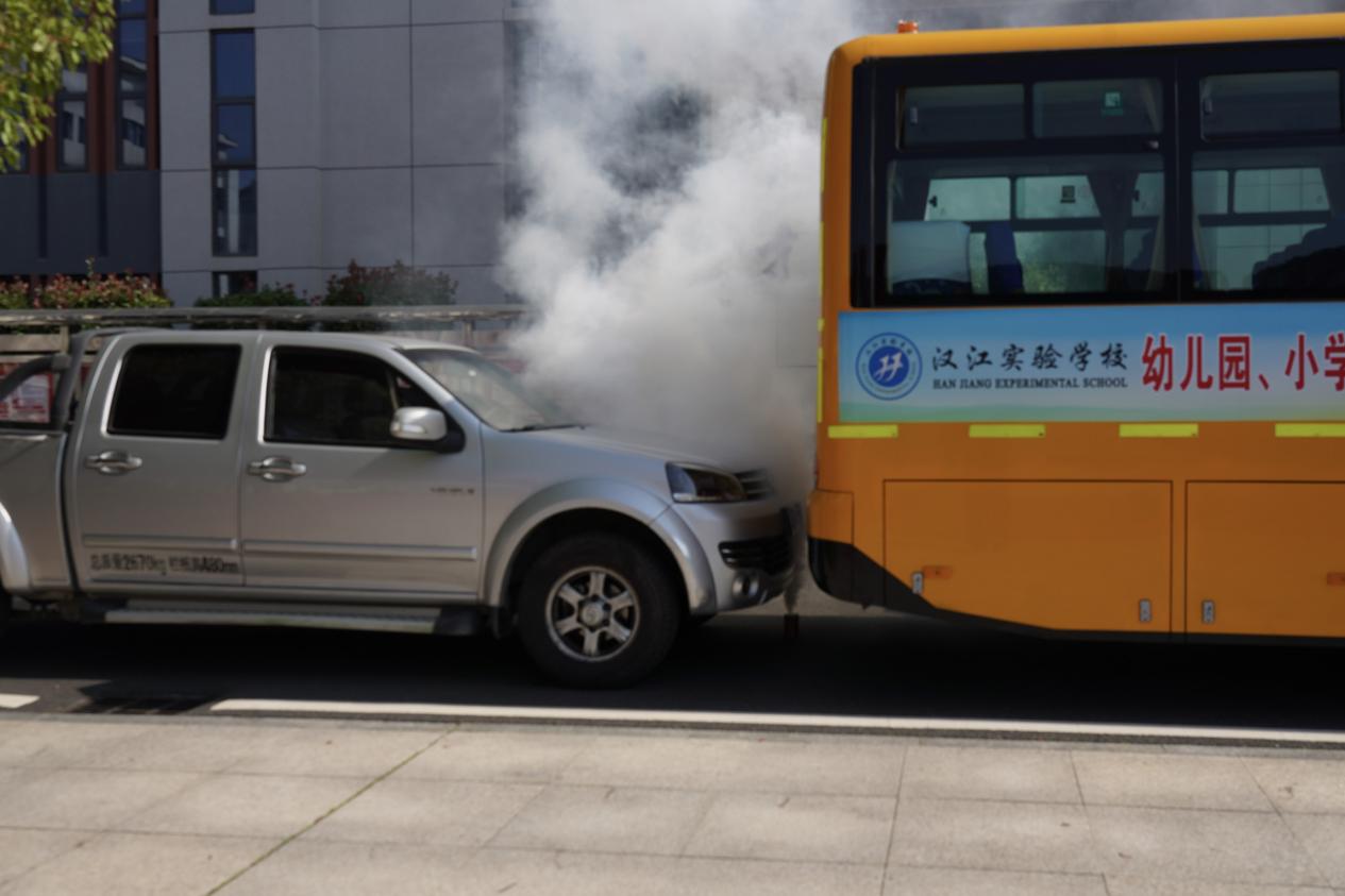 演练模拟校车在行驶过程中,被车辆追尾自燃起火的情景。随着跟车老师发出“校车事故”的信号,司机听令后迅速停车,打开车门和双闪警示灯,平稳停靠至安全区域。与此同时,跟车老师迅速组织学生按照预定路线有序撤离,学生们快速通过安全门,集合到安全区域,整个过程紧张而有序。