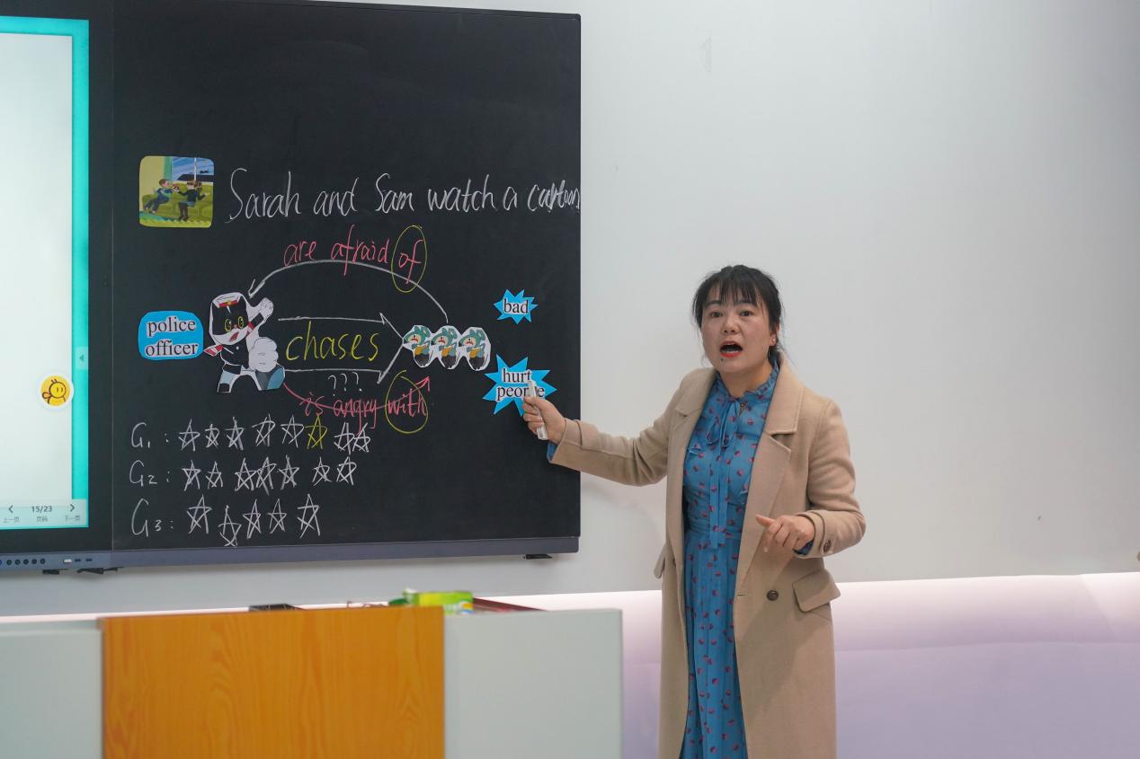 活动开篇,由六年级英语教师王仙叶带来生动精彩的示范课。王老师创设动画情景教学,同时针对学生的年龄特点,注重学法指导,通过看、听、说、演等活动形式,引导学生深入理解文本、灵活运用文本、积极创新文本,整个课堂充满活力,学生们展现出浓厚的英语学习热情。