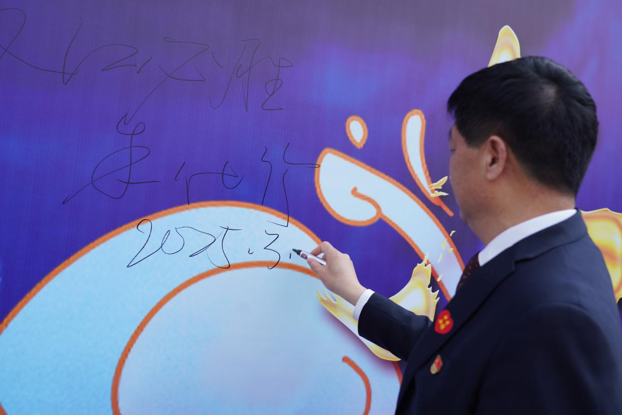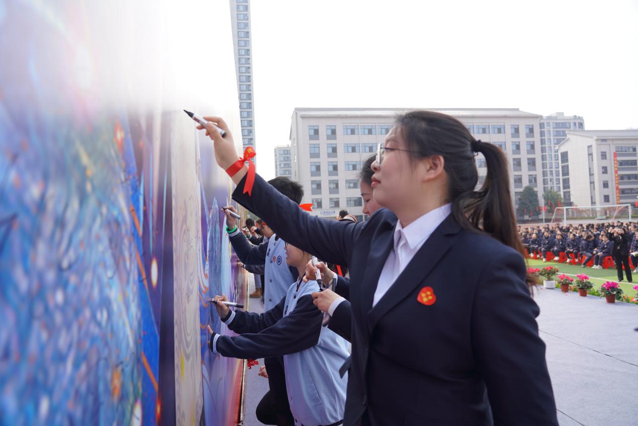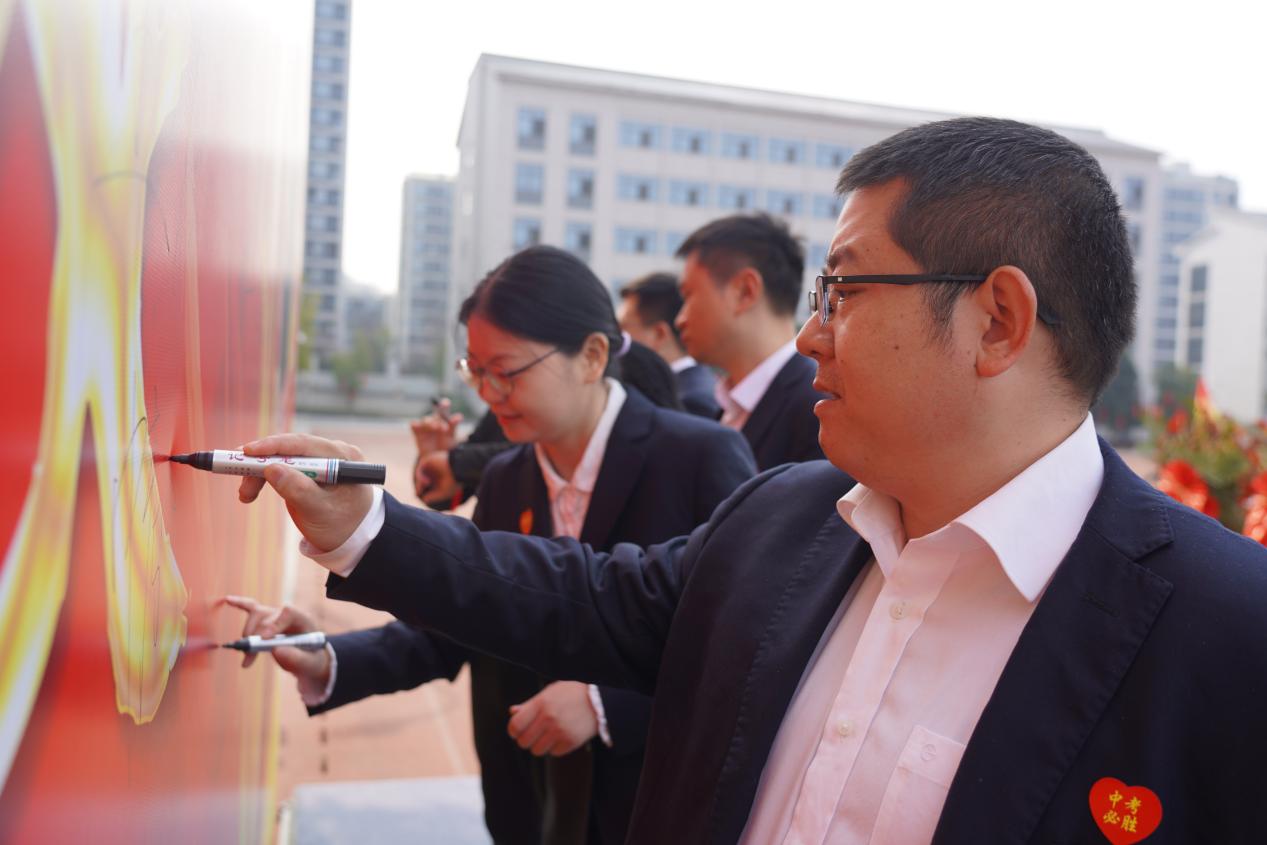 校领导、九年级学生代表和全体教师签名明志,每一个签名都代表着一份坚定的信念和对未来的期许。