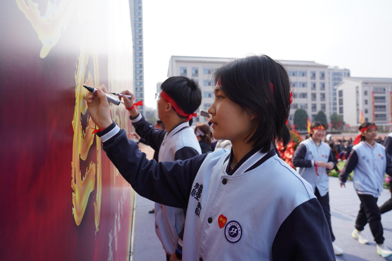 学生执笔书写中考目标,并签署姓名,笔尖落下的既是承诺,亦是青春的见证,寄托着梦想远航。