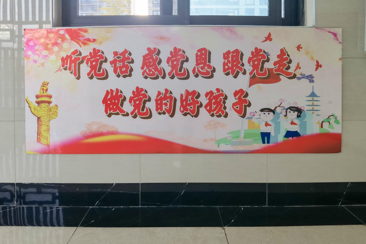 走廊上,红色标语悬挂其间,引导学生提升政治意识,加强党性修养,打好人生底色。