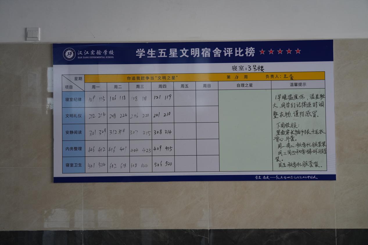 宿舍评比栏展示着每周的文明宿舍名单,提醒学生们保持宿舍整洁。