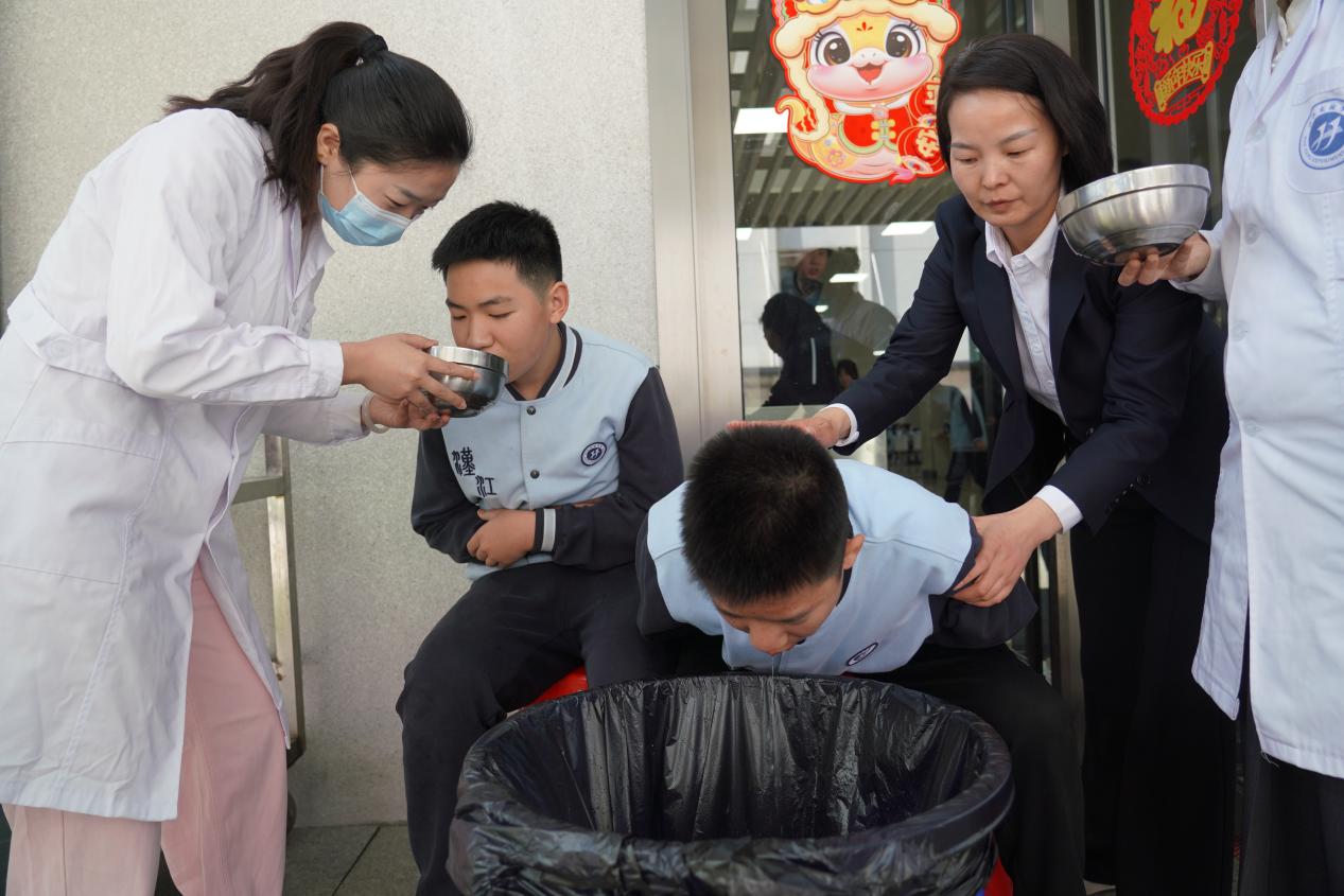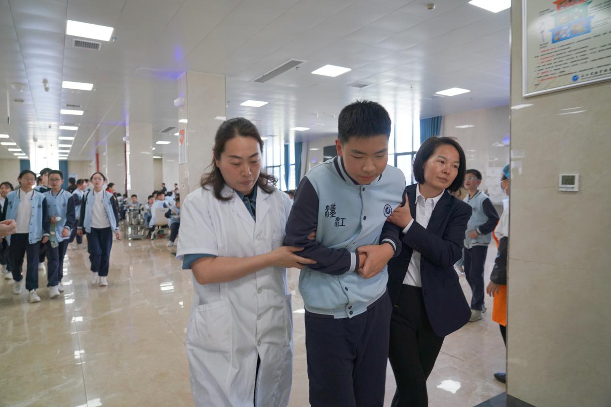 演练模拟场景设定在学校食堂二楼就餐过程中,八年级的两位同学在用餐时突然出现身体不适症状,疑似食物中毒。食堂主管发现后,第一时间赶现场查看,并迅速上报情况,同时拨打校医电话。