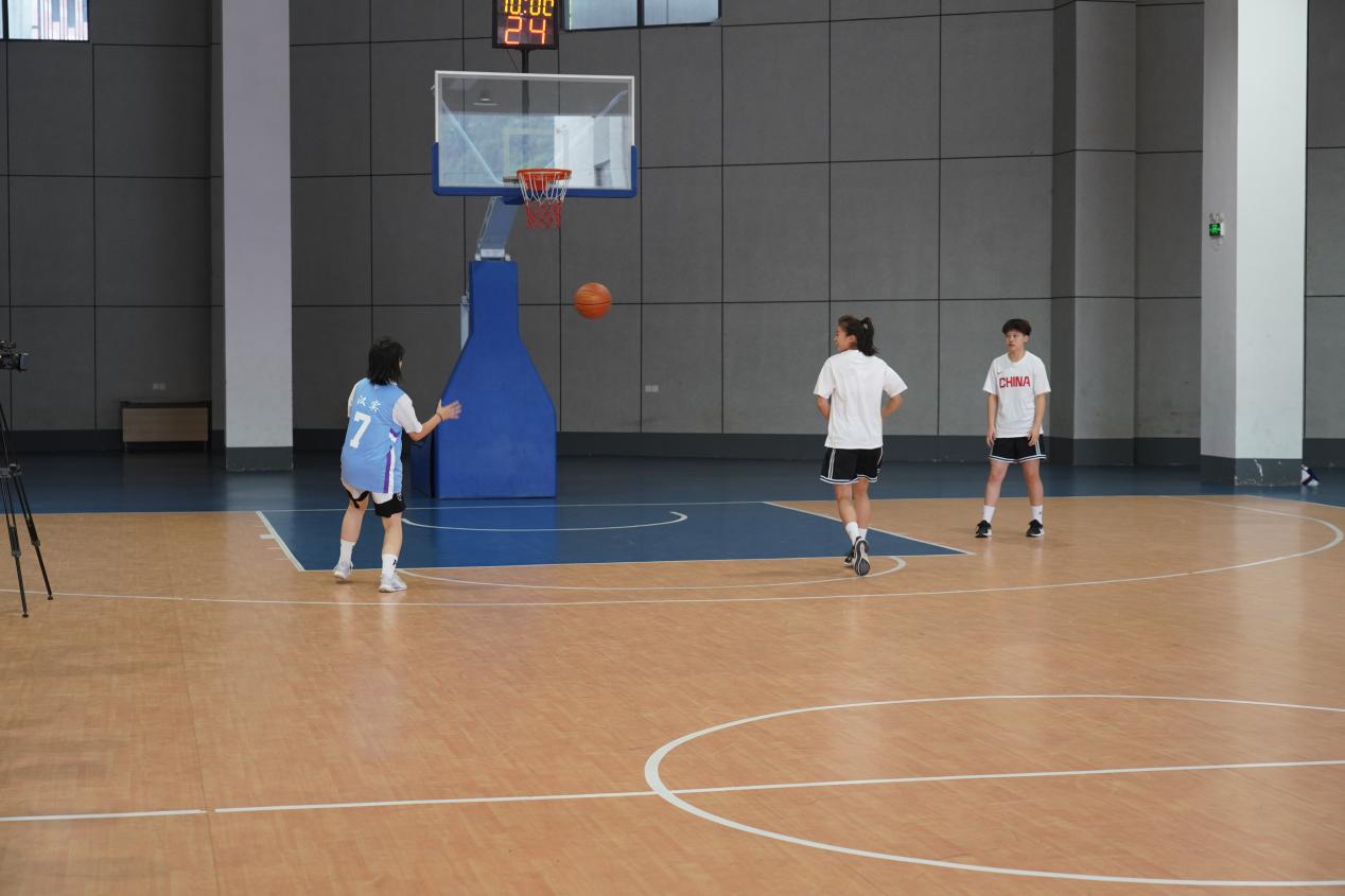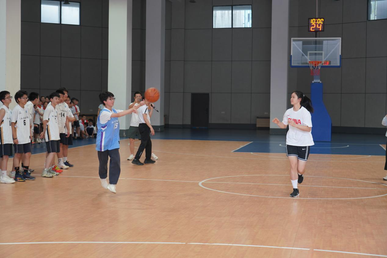 在备受期待的篮球技巧教学环节,王嘉欣和队友们亲自上阵,为同学们展示了扎实的基本功。她们流畅地示范了高低运球的控制技巧以及快速实用的变向运球动作要领。并通过“传球接力”游戏,将趣味性与技术训练完美结合,在游戏中提升团队协作能力和基本功。