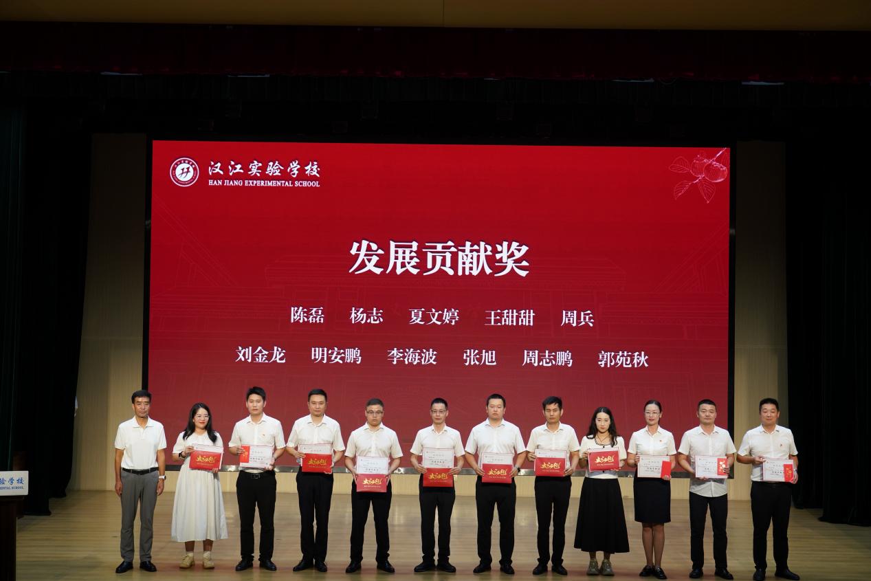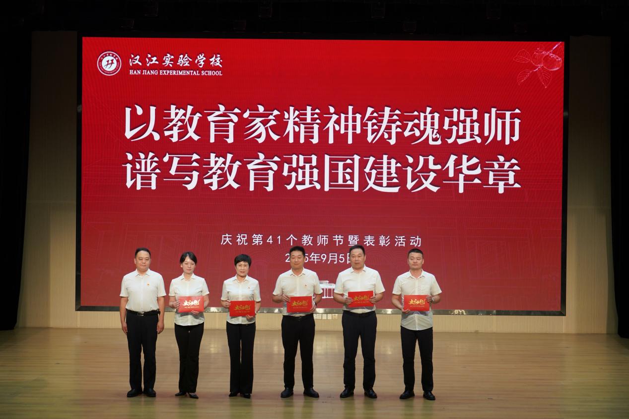 汉江教育党总支书记陈伟为汉江实验学校五位优秀管理团队成员颁发奖项,表彰他们在学校管理工作中的突出贡献。