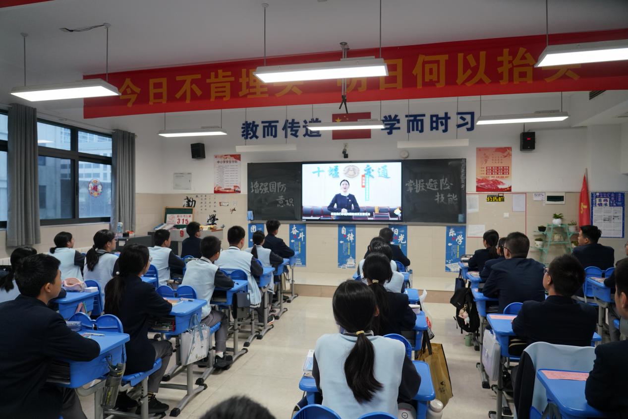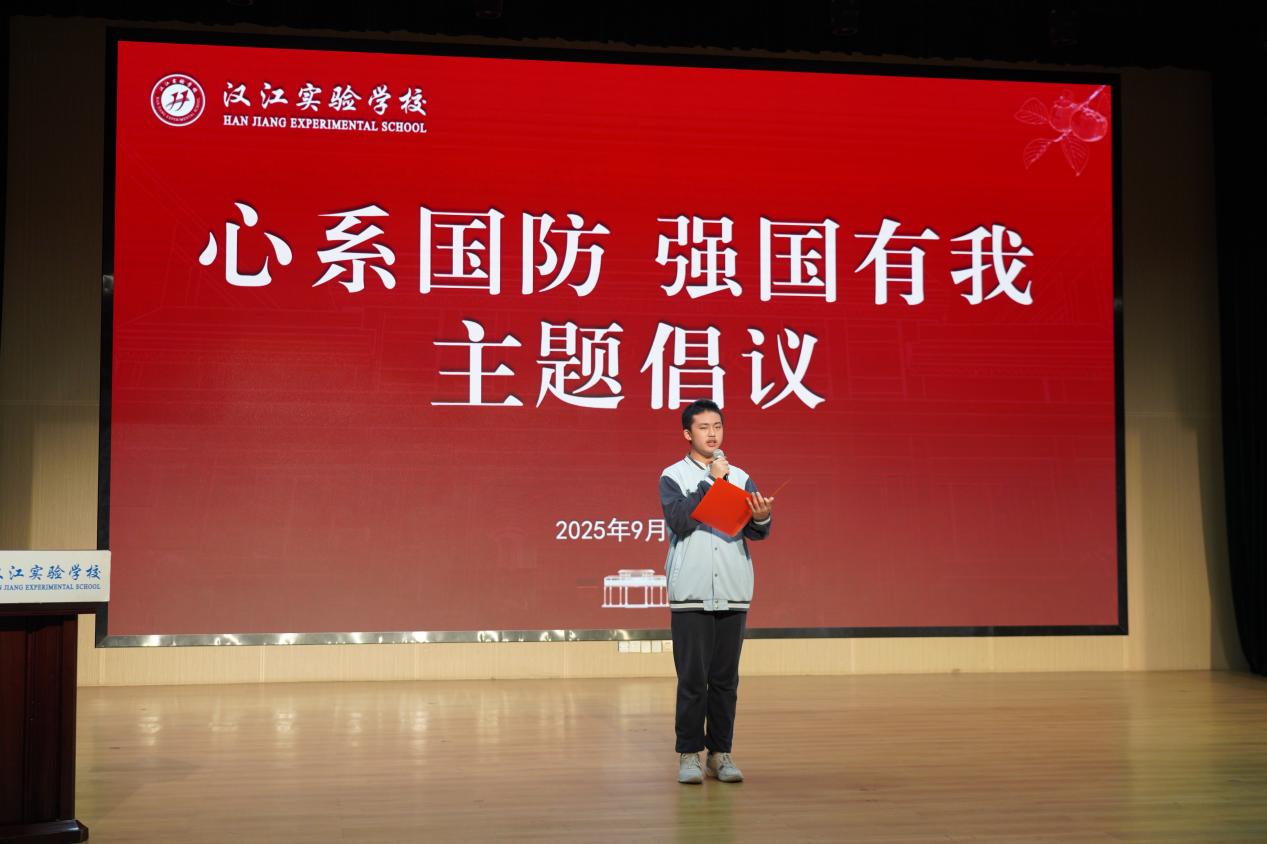 八(7)班学生代表秦逸轩现场宣读《国防教育倡议书》,呼吁全体同学积极学习国防知识,做历史记忆的守护者,国防知识的求知者,国防实践的参与者,国防建设的宣传者,时代使命的担当者,积极书写青春报国新篇章。
