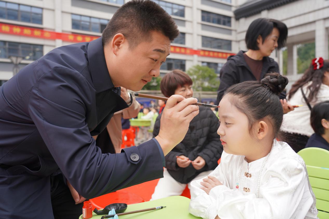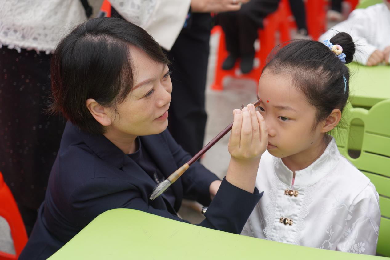 校领导用朱砂在学子们的额头正中点上红痣,“痣”通“智”,意为开启智慧,祝福孩子们眼明心亮,好读书、读好书。
